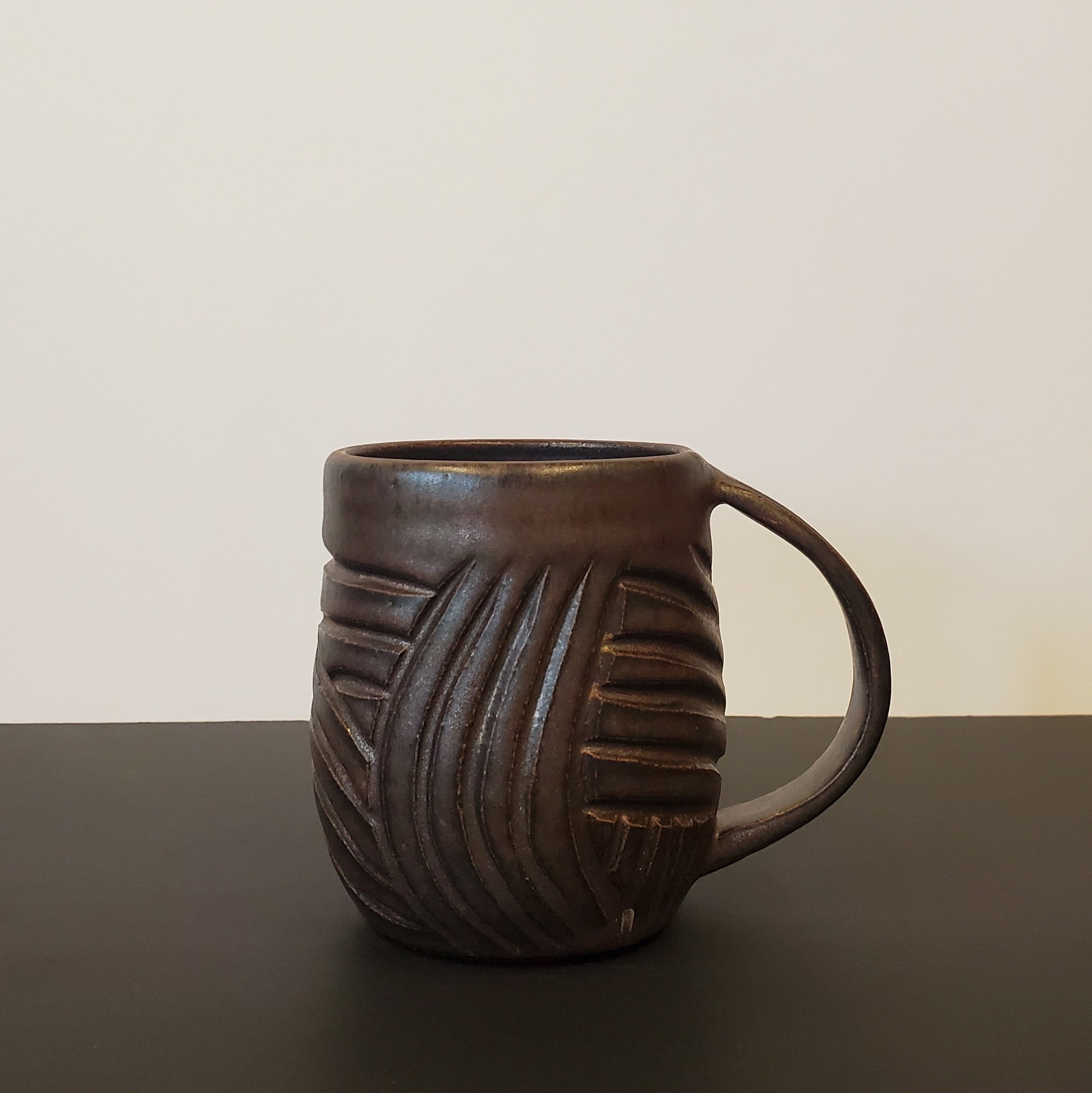 Deep charcoal/bronze glaze with bold hand-carved texture. Microwave and dishwasher safe. Holds 10 oz. of liquids.