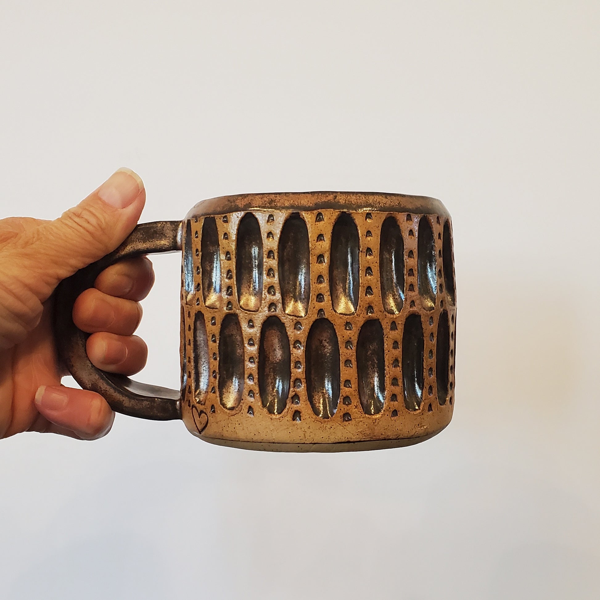 A handcrafted rustic bronze-brown ceramic mug with bold carved coliseum patterns, blending earthy tines and metallic sheen for a striking, timeless look. Microwave and dishwasher safe.