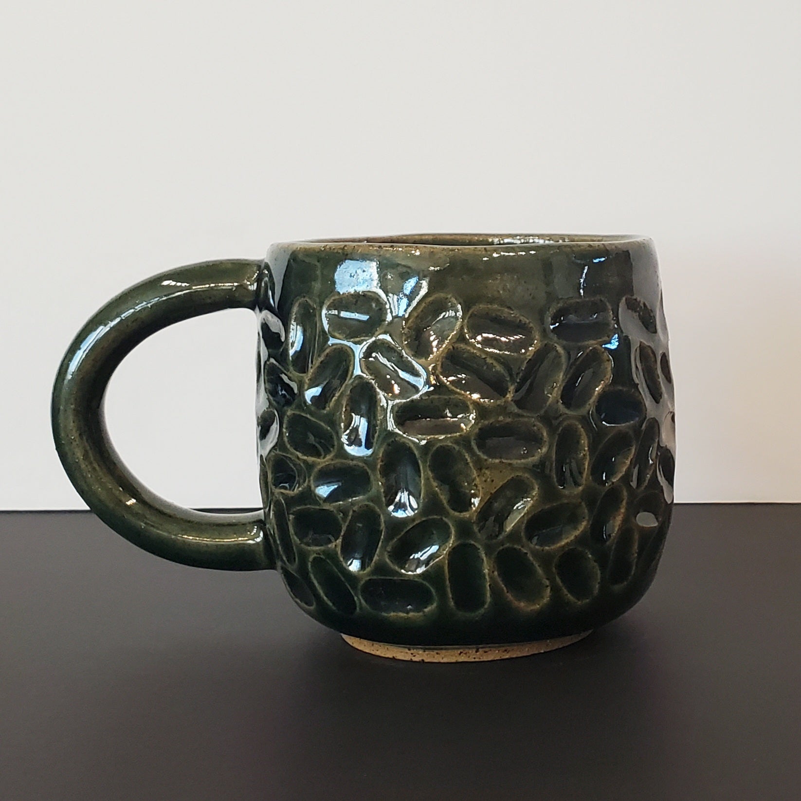 Handcrafted stoneware mug with a deep green glaze and bold carved texture. Unique, and earthy. Microwave and dishwasher safe.
