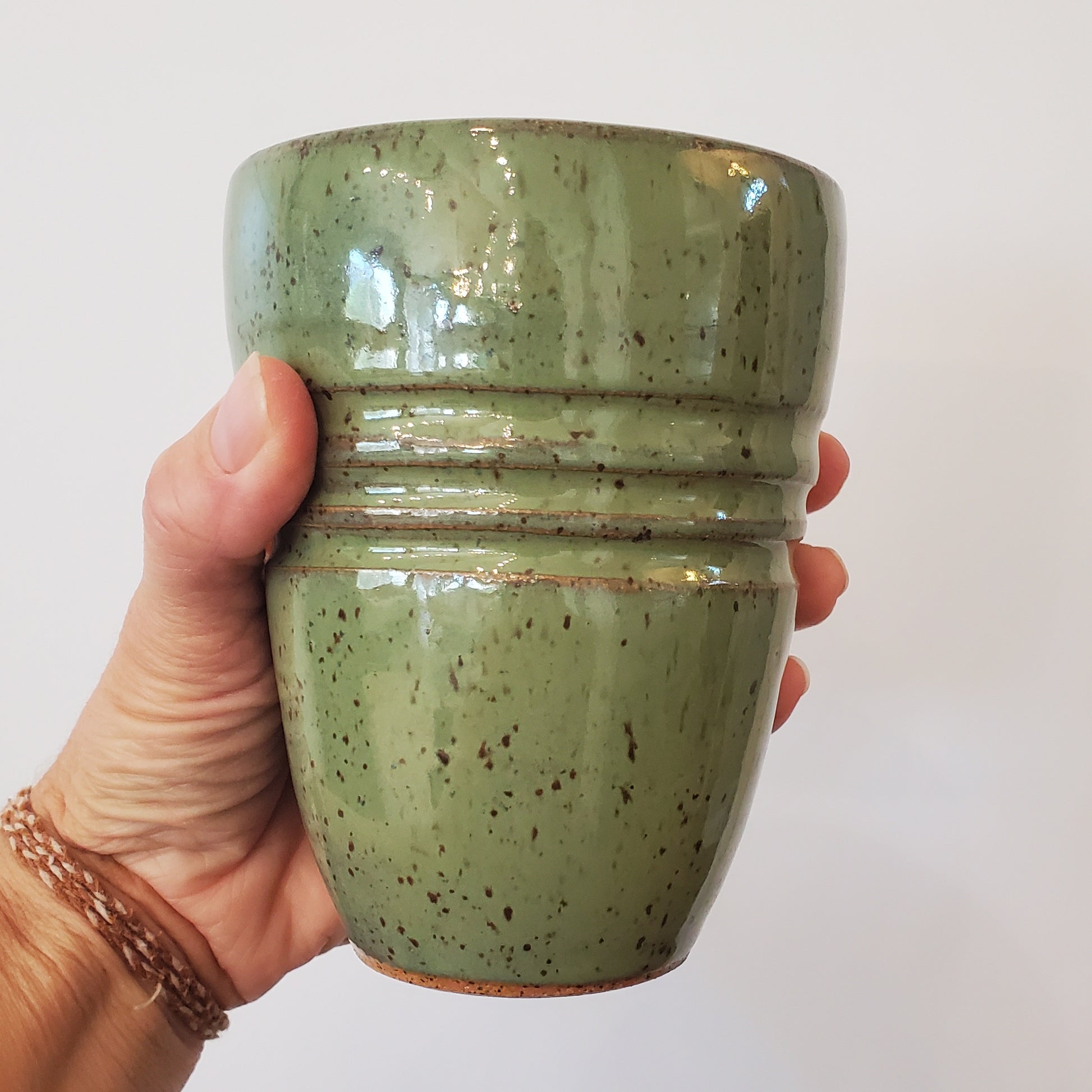 A handcrafted ceramic cup glazed in earthy green with natural speckling and subtle ridges for added texture and grip. Microwave and dishwasher safe.