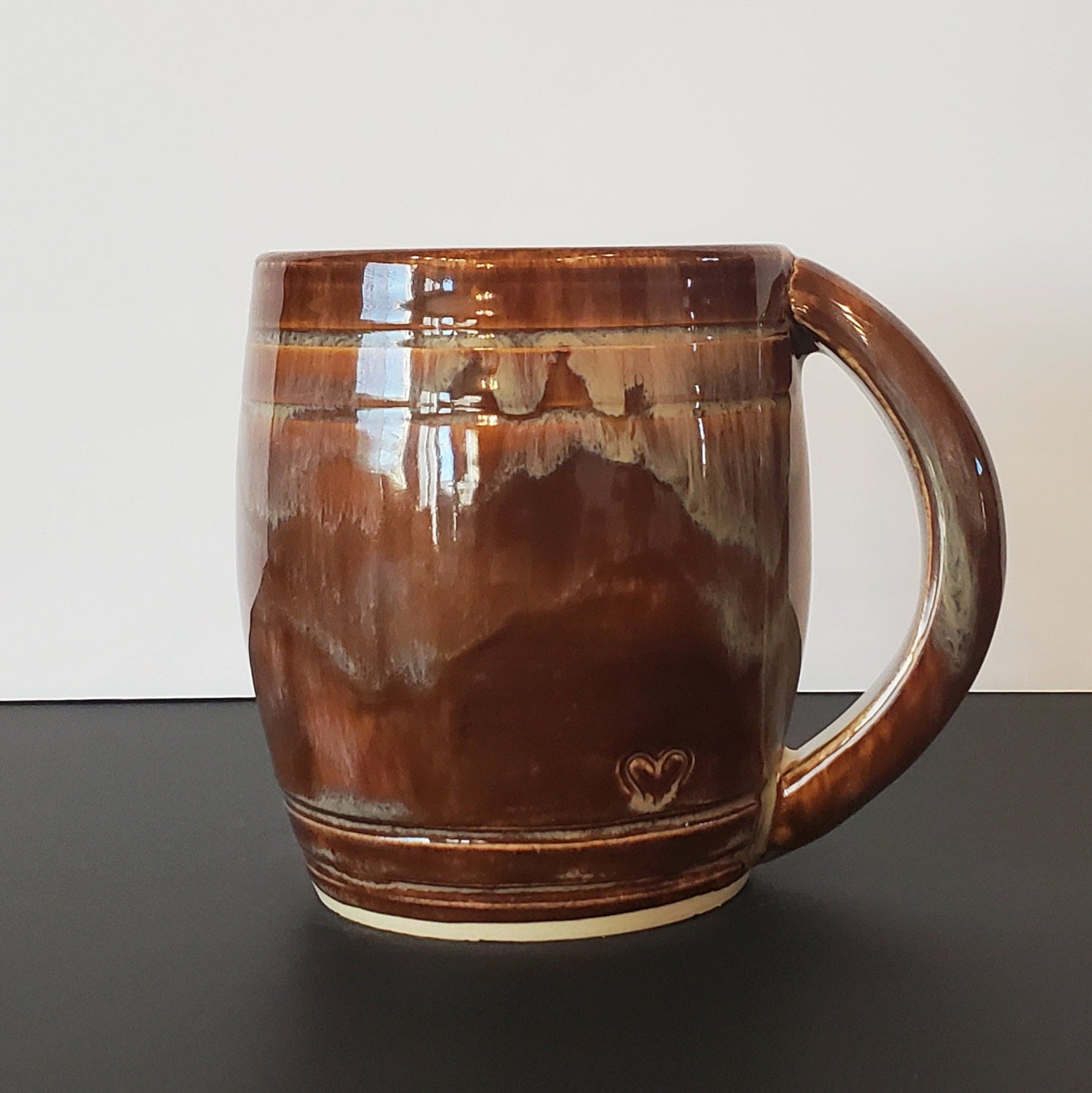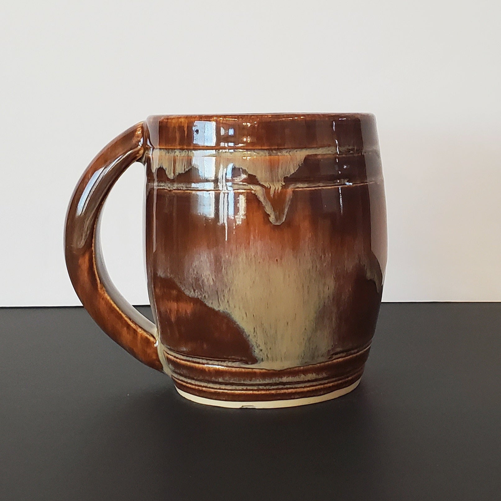 Handcrafted stoneware mug witha. glossy mocha-brown glaze with soft cream drips. Warm and rich. Mmicrowave and dishwasher safe.