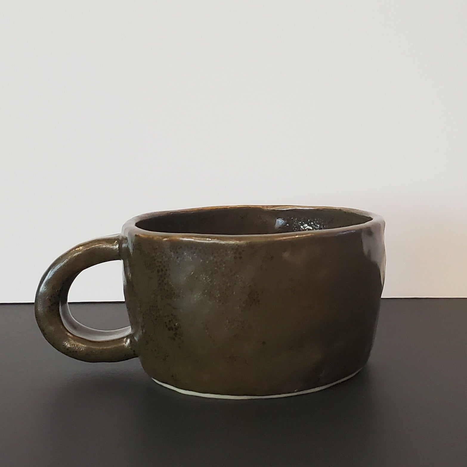 Handcrafted stoneware mug with a deep charcoal glaze and organic form, with a little texture. Microwave and dishwasher safe.