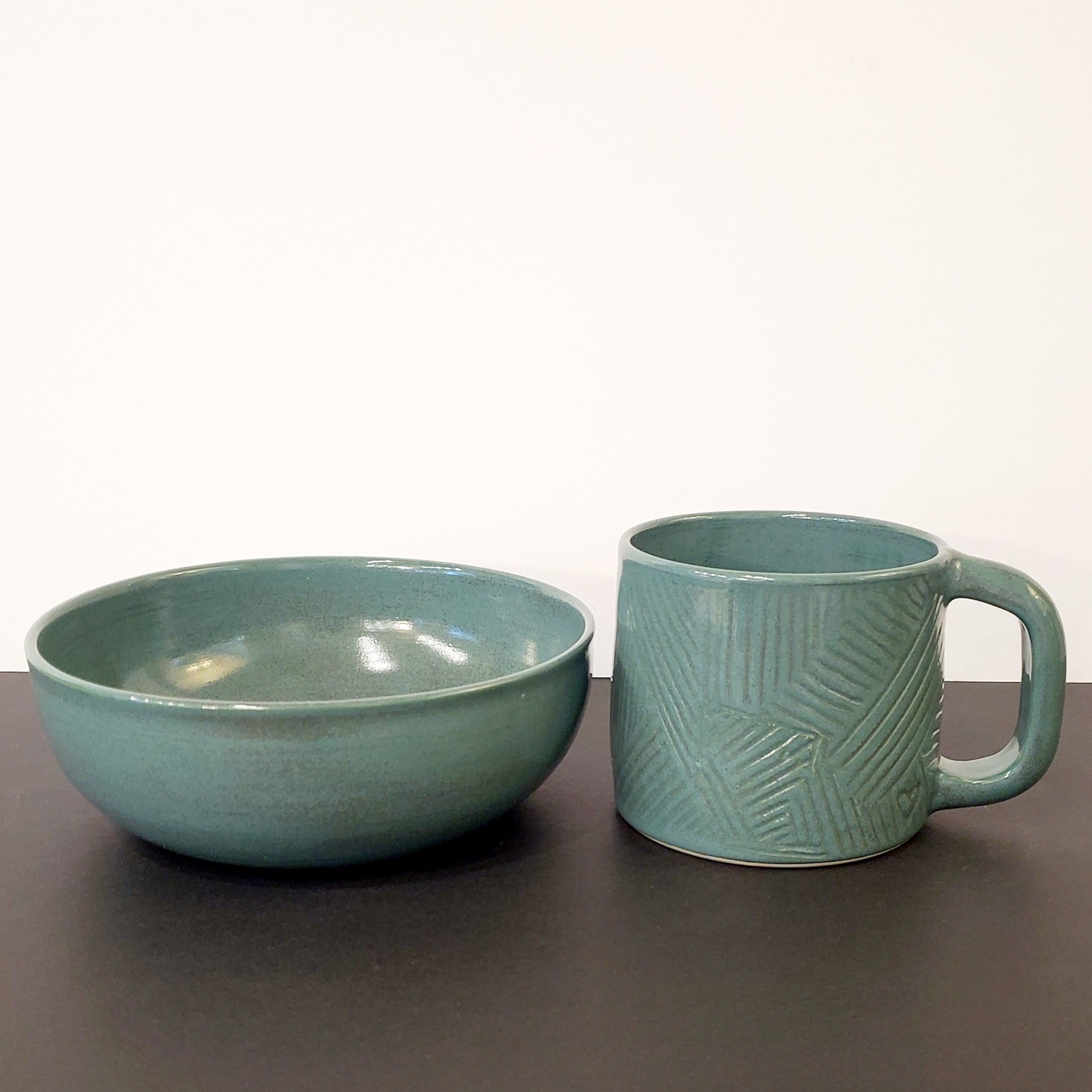 Handcrafted ceramic bowl in a soothing teal blue glaze with a hint of gray. Ideal for everyday use-perfect for cereal, soup, snacks, or a small salad. It even has a matching mug in the shop (it is not included with the bowl). Microwave and dishwasher safe.